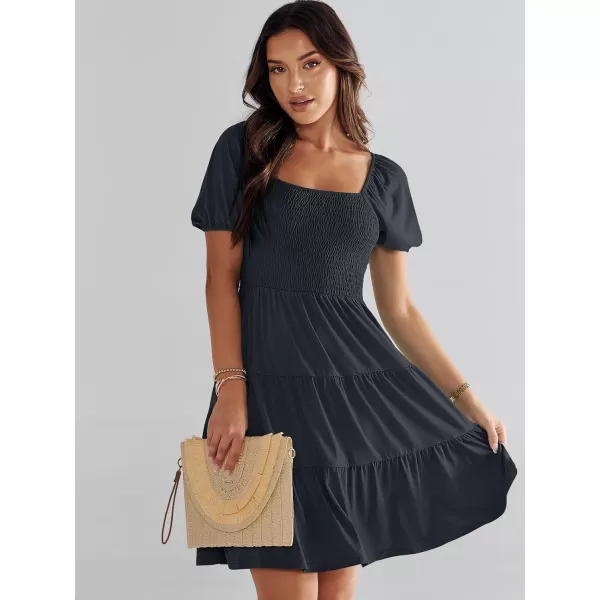 ANRABESS Women’s Summer Mini Dresses 2024 Casual Square Neck Smocked Puff Sleeve Cute Short Dress(Dark Blue)