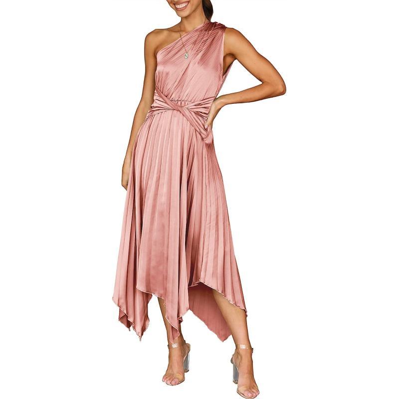 ANRABESS Women’s Summer One Shoulder Midi Dress Sleeveless Twist Pleated Asymmetric Satin Cocktail Party Dress(Pink)