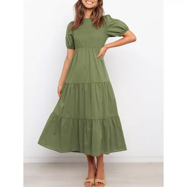 ANRABESS Women's Summer Short Sleeve Crewneck Smocked Sundress Tiered Swing A Line Beach Midi Dress with Pockets(Army Green)