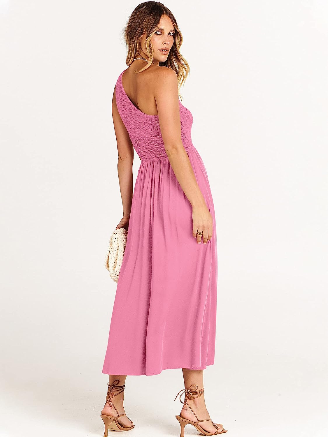 ANRABESS Women’s Summer Sleeveless Smocked One Shoulder Cutout Sundress Flowy A-Line Beach Long Maxi Dress(Pink)