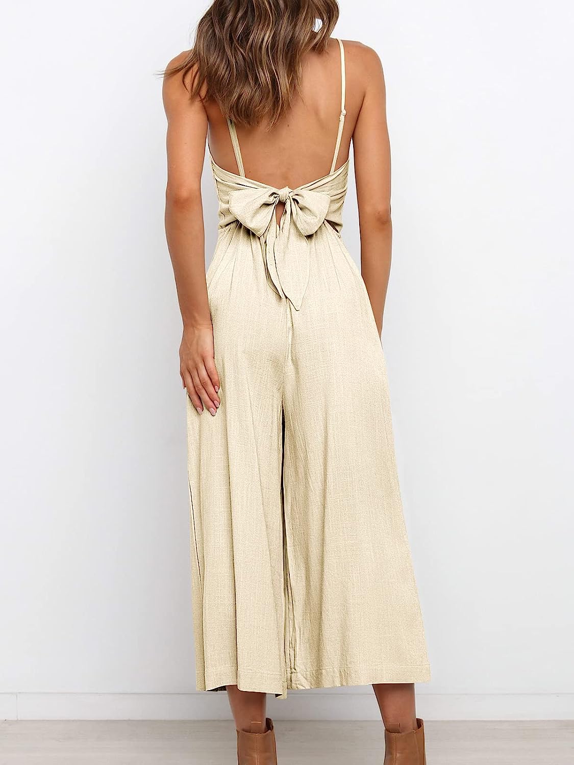 Features – capri length,straight neckline,sleeveless,adjustable spaghetti strap,high waist,tie back,cropped pant,wide leg,hidden pockets.