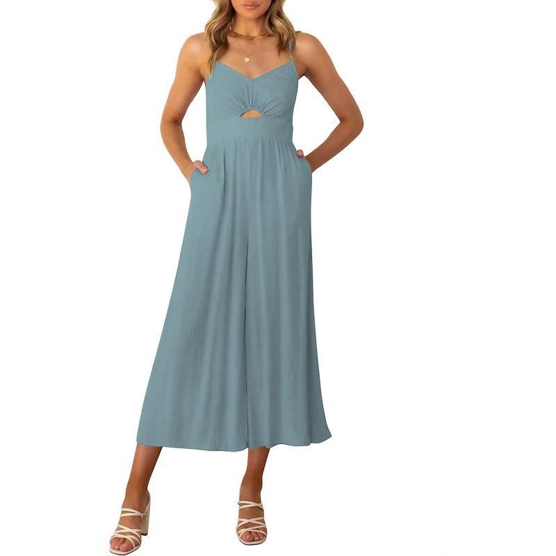 Highlights – This jumpsuit has a amazing cutout on front give a super cool style! The spaghetti straps make backless perfect for summer,stretchy shirred back waistband suit any bodyshape,casual wide leg pants makes this jumpsuit must have in this summer!