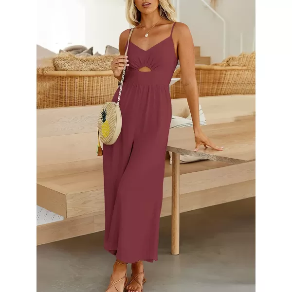 imageANRABESS Womens Summer Spaghetti Straps V Neck Cutout Smocked High Waist Wide leg Jumpsuits Rompers with PocketsRose