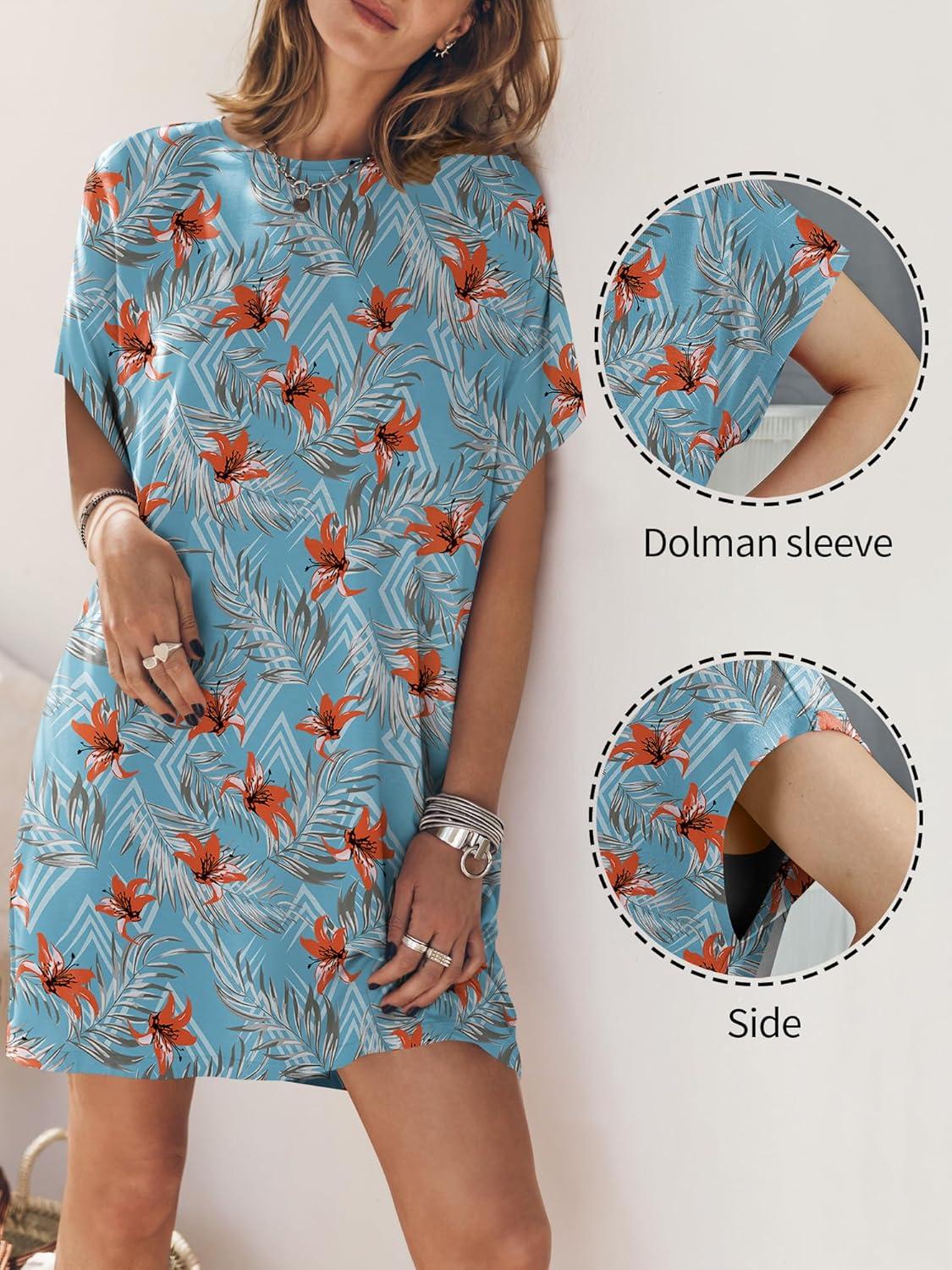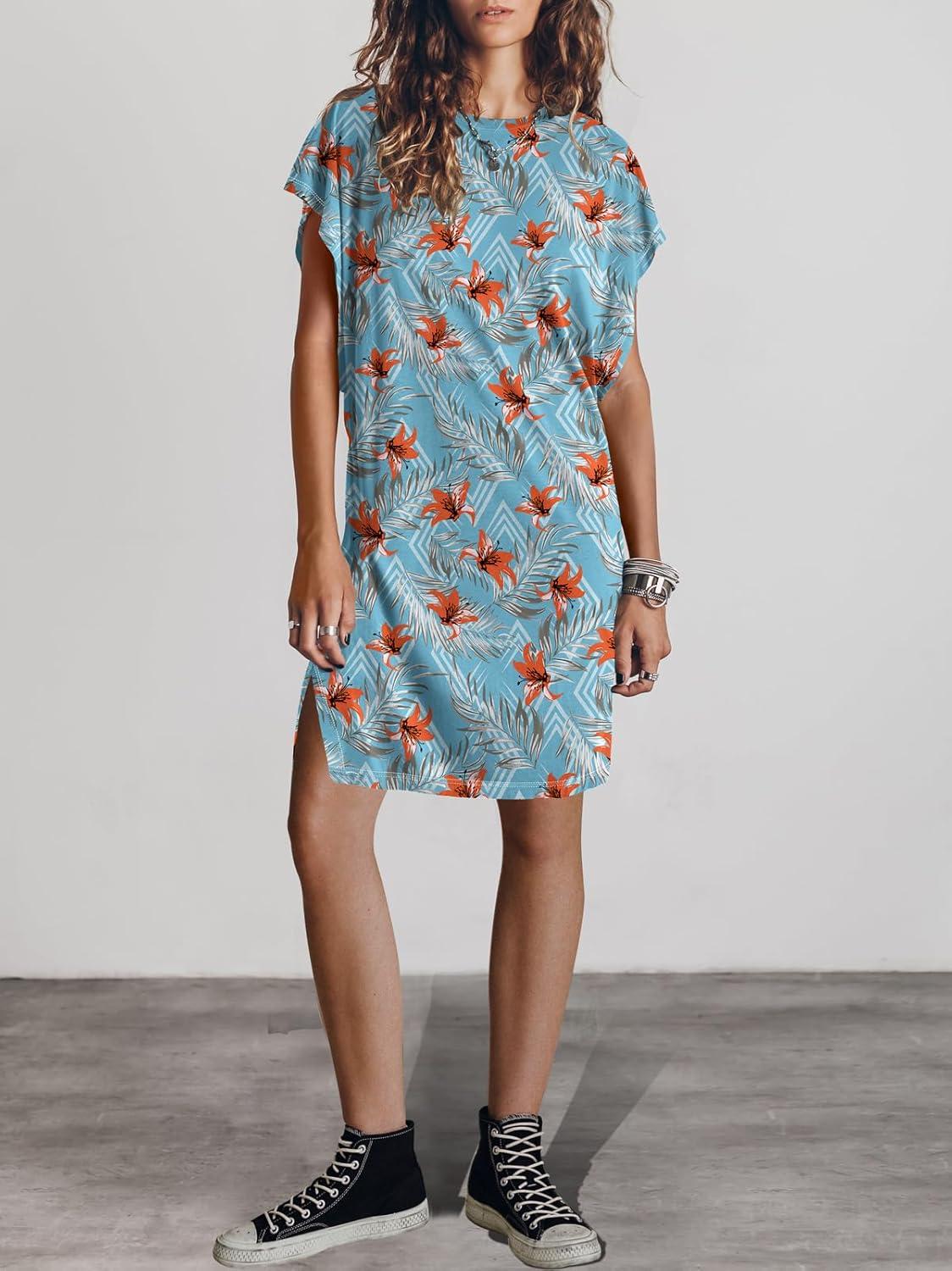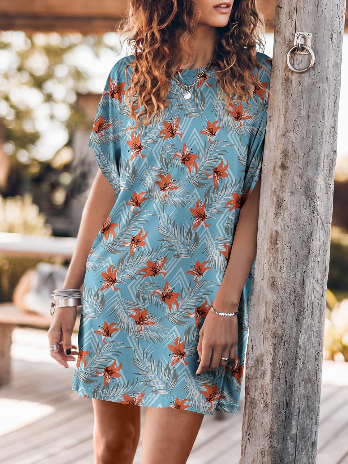 ANRABESS Women’s Summer T Shirt Dress 2025 Beach Vacation Travel Outfits Casual Simple Soft Mini Sundress Cover Up Clothes(Floral Blue)