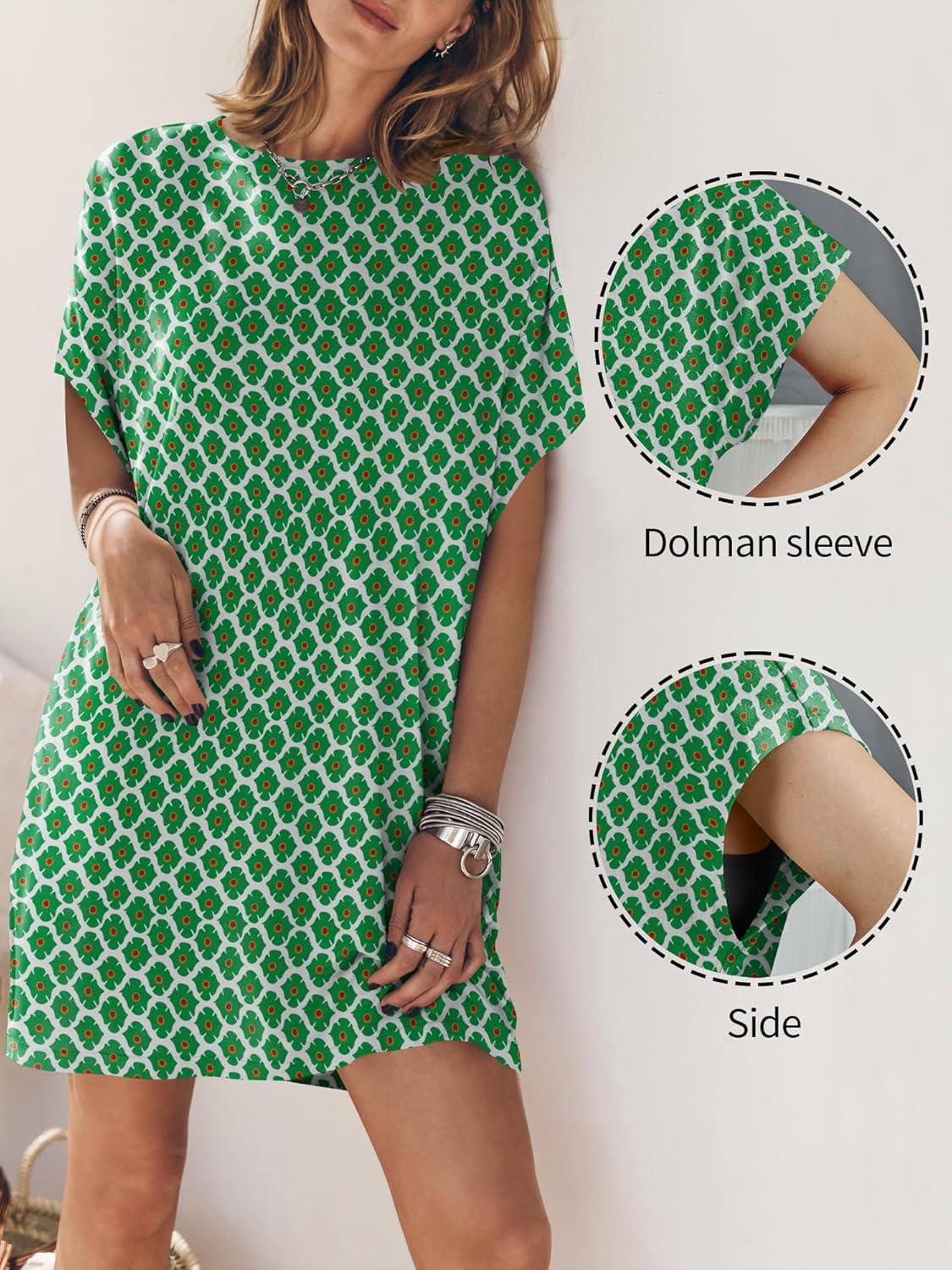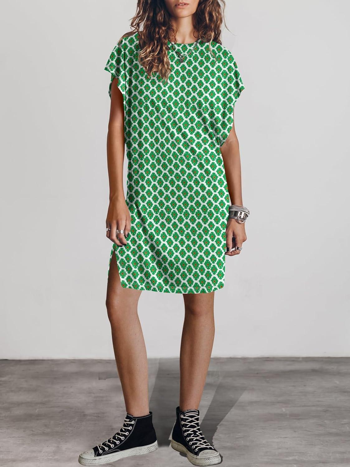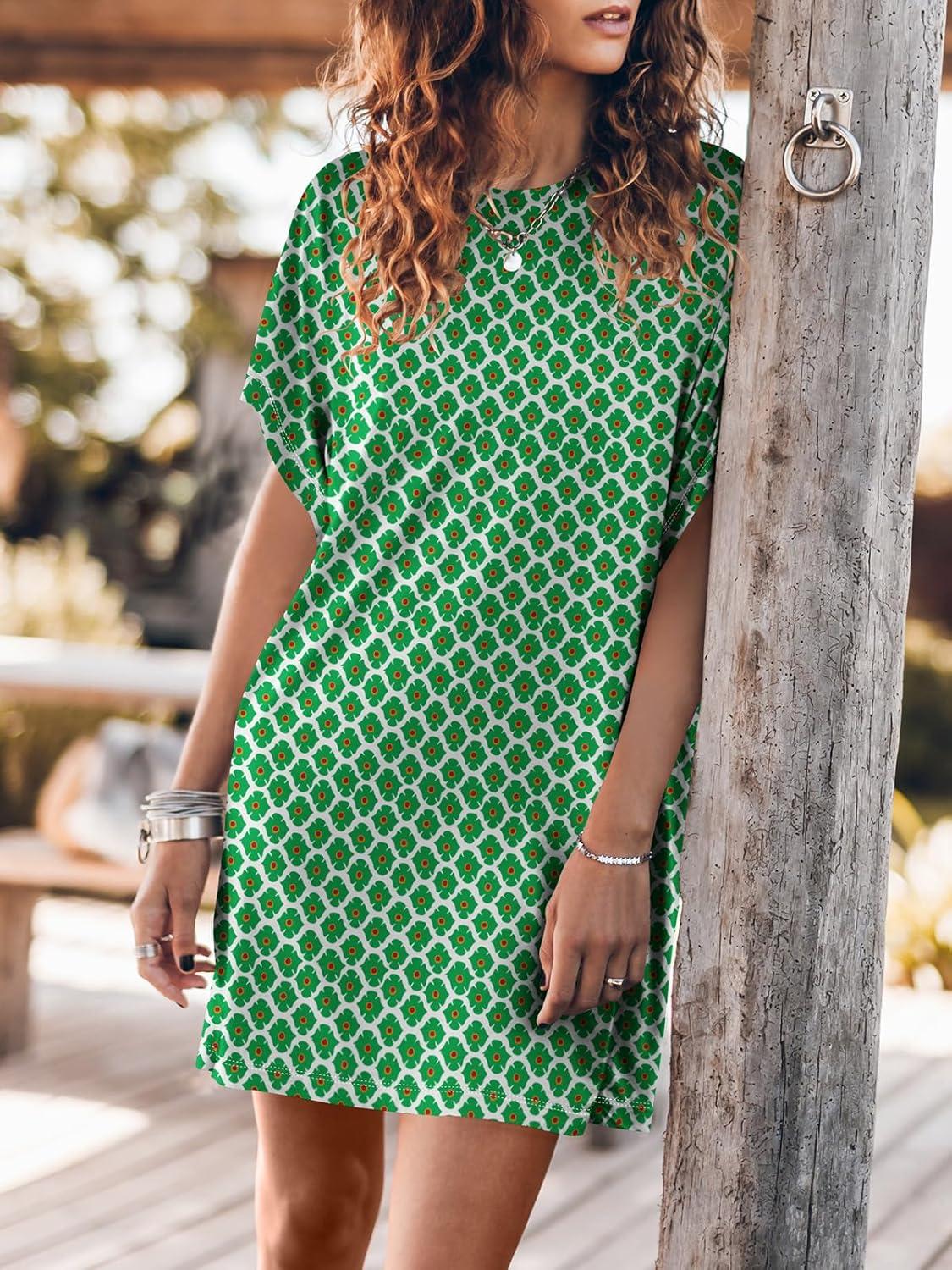 ANRABESS Women’s Summer T Shirt Dress 2025 Beach Vacation Travel Outfits Casual Simple Soft Mini Sundress Cover Up Clothes(Floral Green)