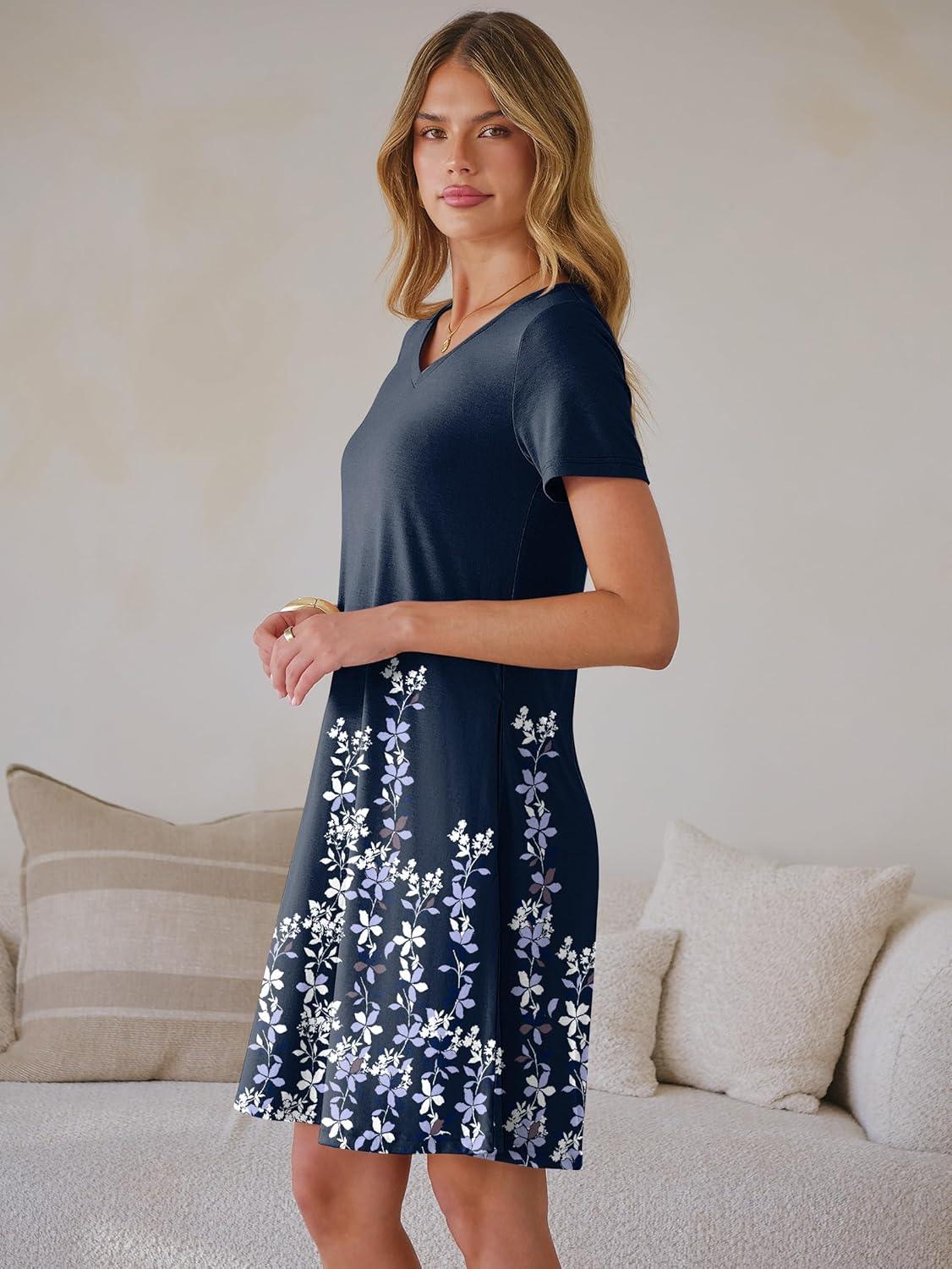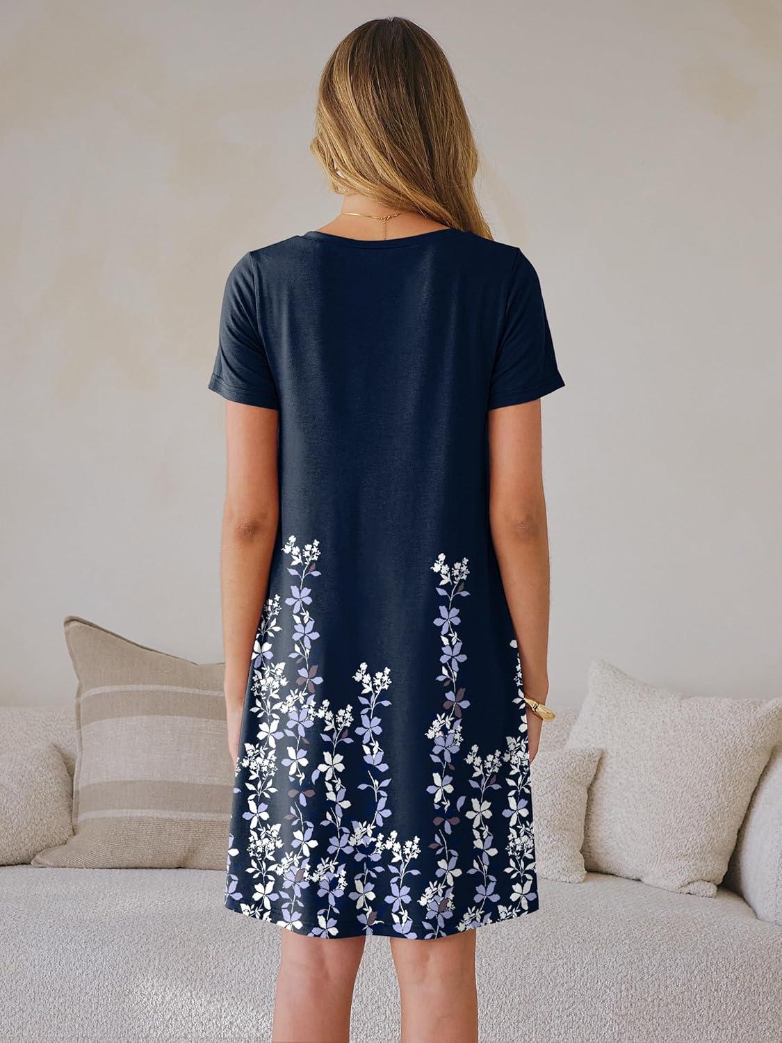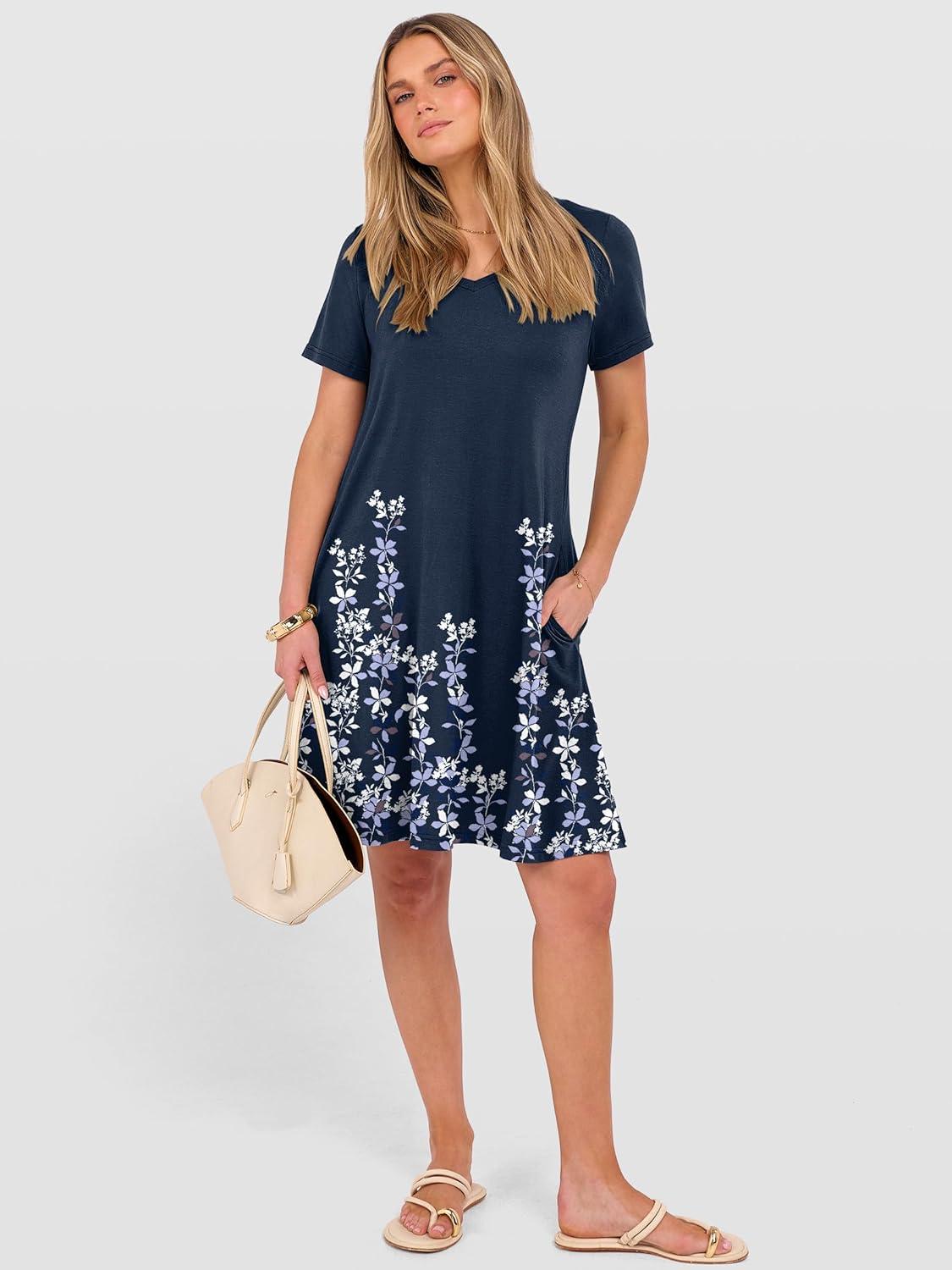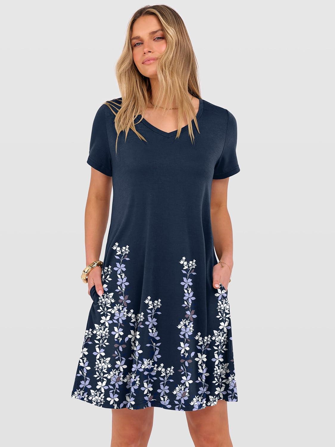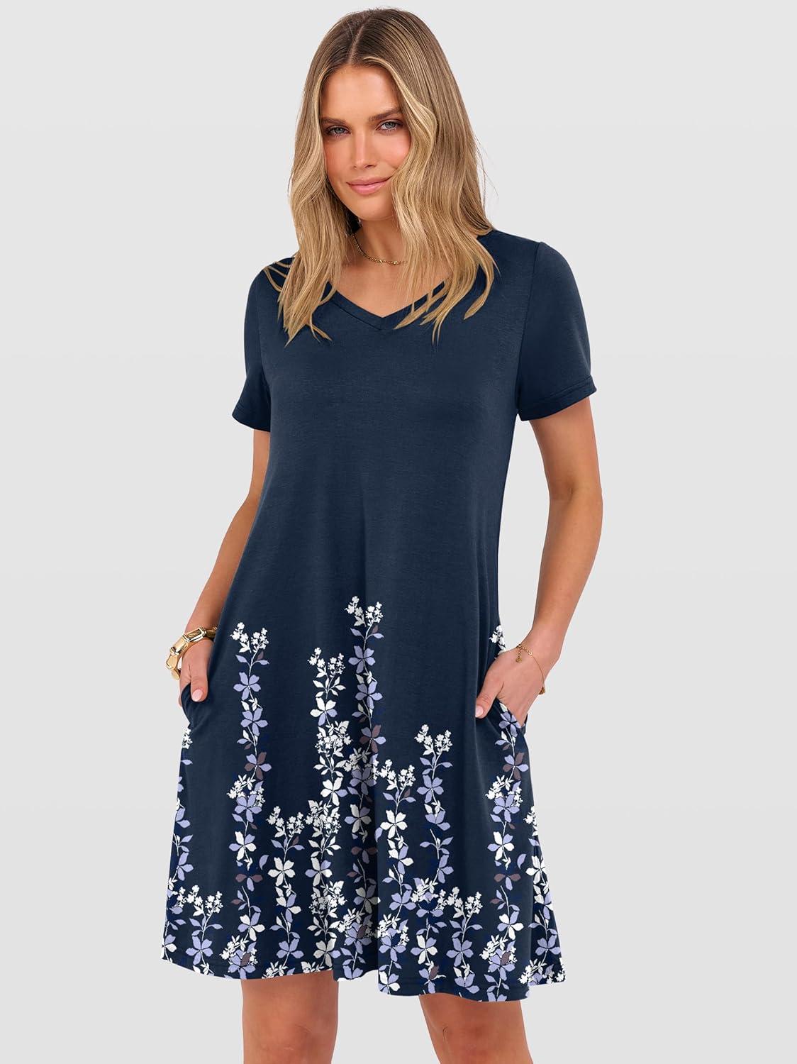 ANRABESS Women's Summer T Shirt Dress Casual V Neck Short Sleeve Floral Boho Flowy Mini Dresses 2026 Beach Vacation Clothes(Floral Navy Blue Hem)