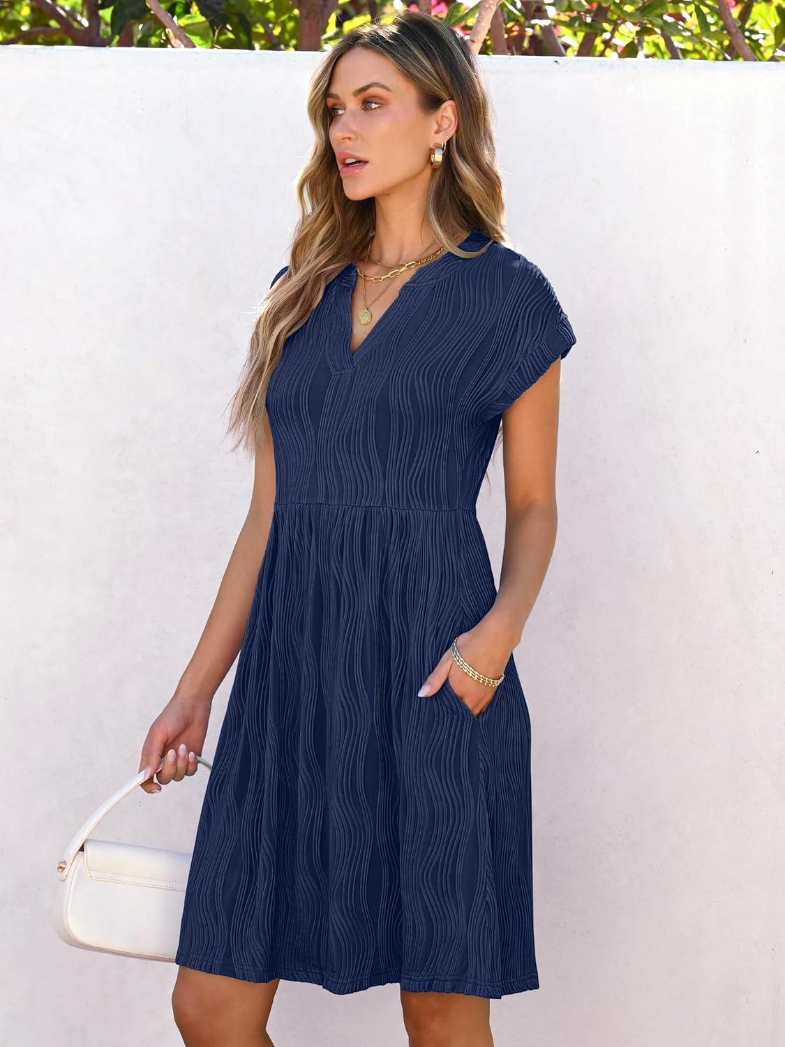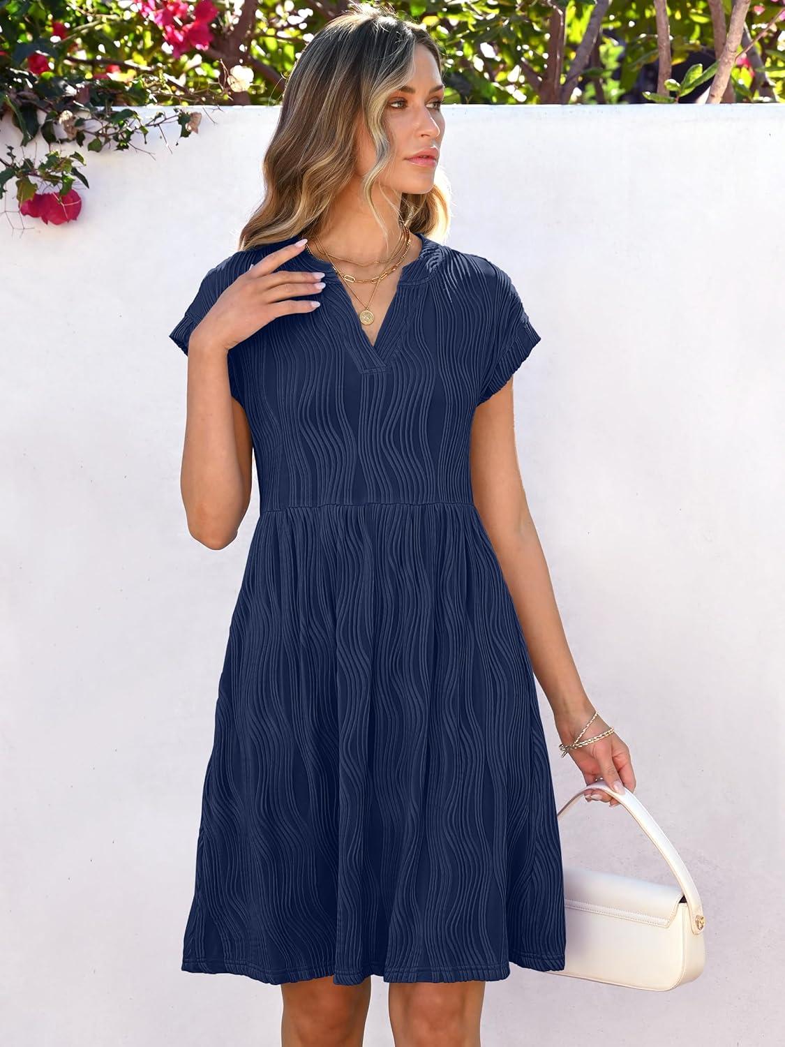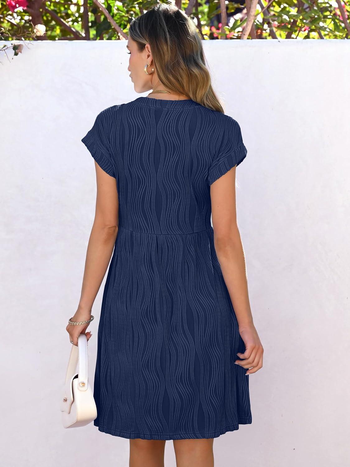 ANRABESS Womens Summer V Neck Cap Sleeve Tunic Short Dress 2025 Casual Fit Textured A-line Beach Vacation Sundress(Navy Blue)
