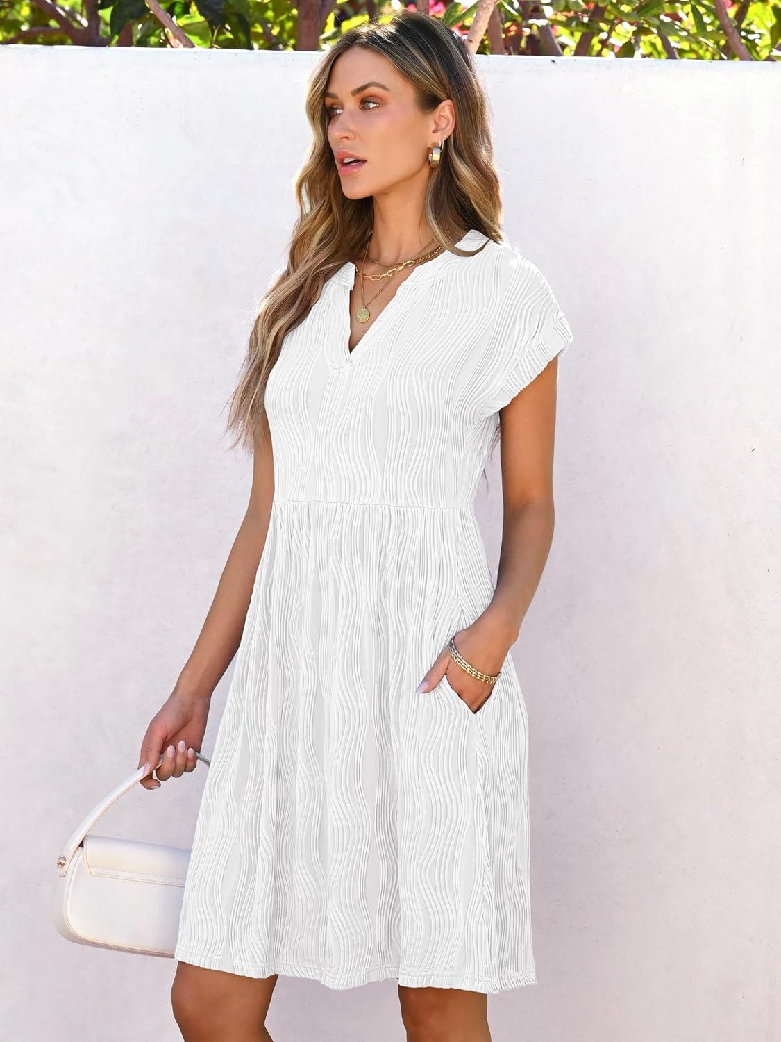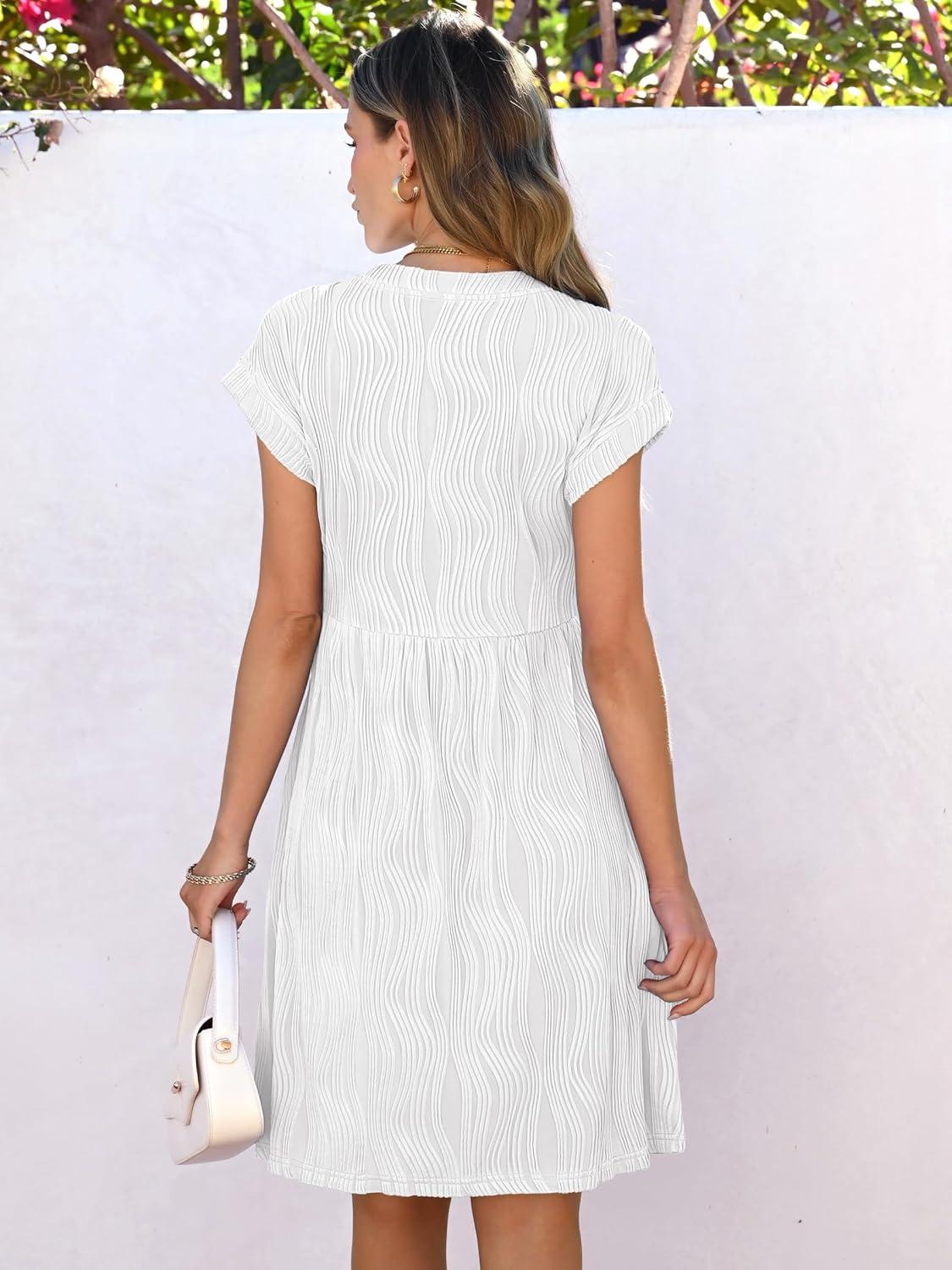 ANRABESS Womens Summer V Neck Cap Sleeve Tunic Short Dress 2025 Casual Fit Textured A-line Beach Vacation Sundress(White)
