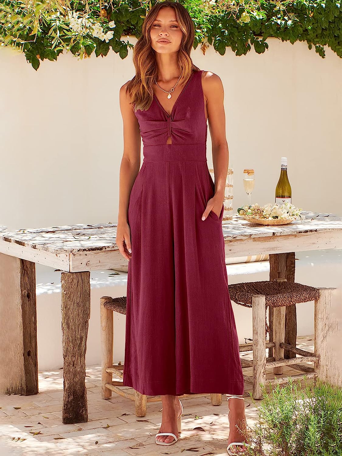 Features – Thick adjustable straps,Invisible back zipper,wide waistband,backless,shirred back waist, v neckline,cutout front,wide leg pants,high waist,hidden pockets.