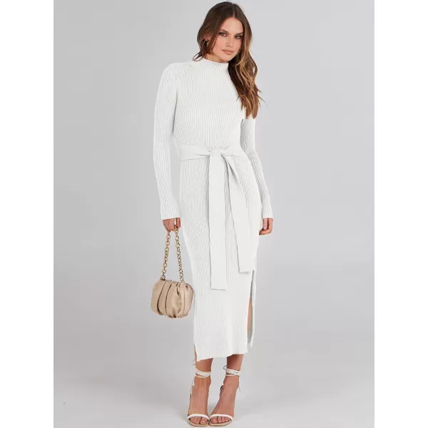 ANRABESS Women's Sweater Dress 2023 Elegant Fall Long Sleeve Mock Neck Tie Waist Slim Fit Slit Sexy Ribbed Knit Midi Dresses(White)