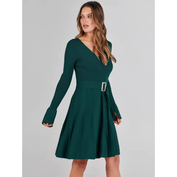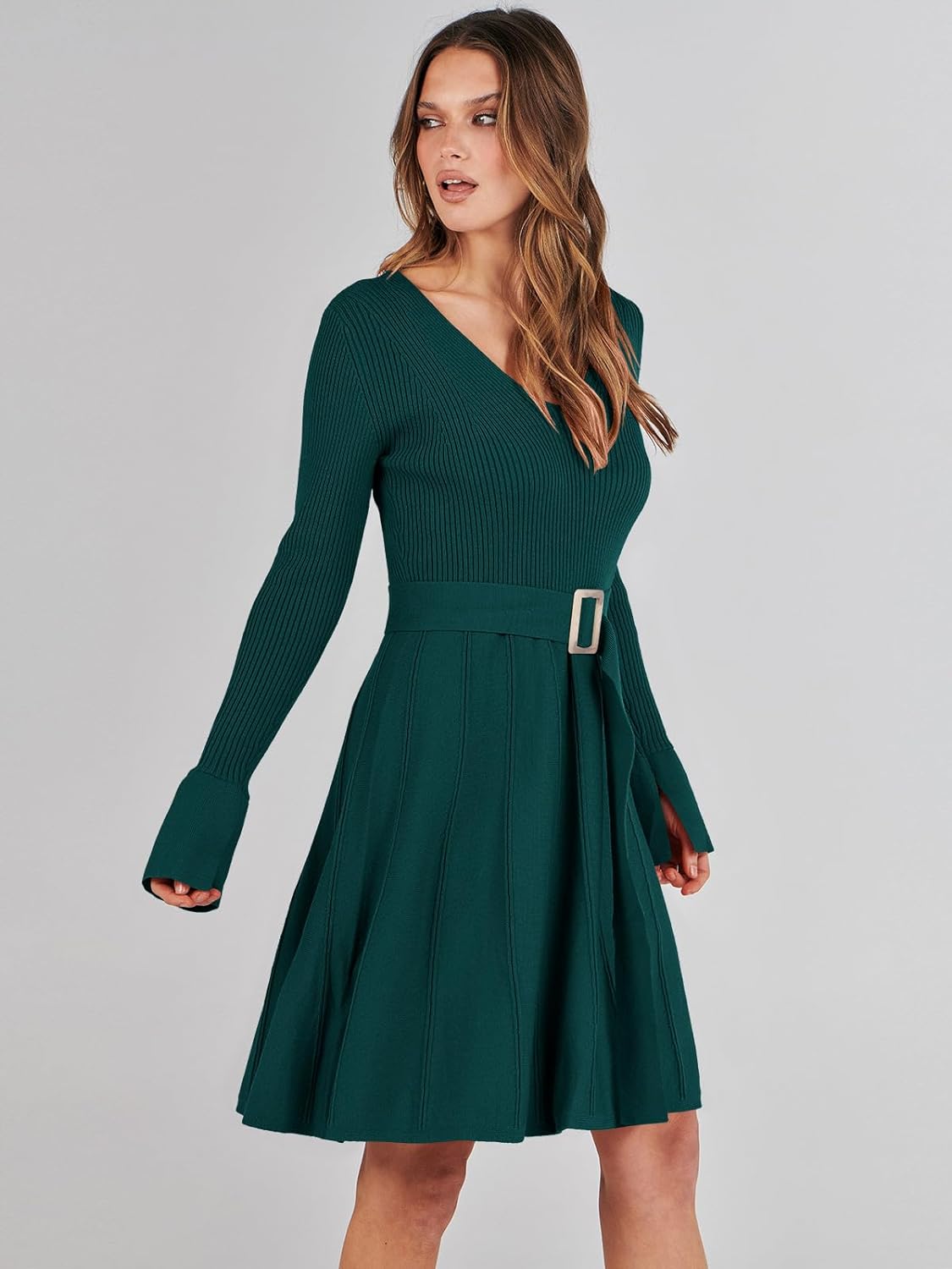 Features – Elevate your fall wardrobe with this chic sweater dress featuring bell long sleeves, a flattering V-neckline, and a trendy tie waist. The ribbed knit fabrication provides a cozy, comfortable feel, while the versatile short length allows for easy layering. The A-line shape with pleated details gives the sweater dress a stylish flair that's perfect for any occasion.