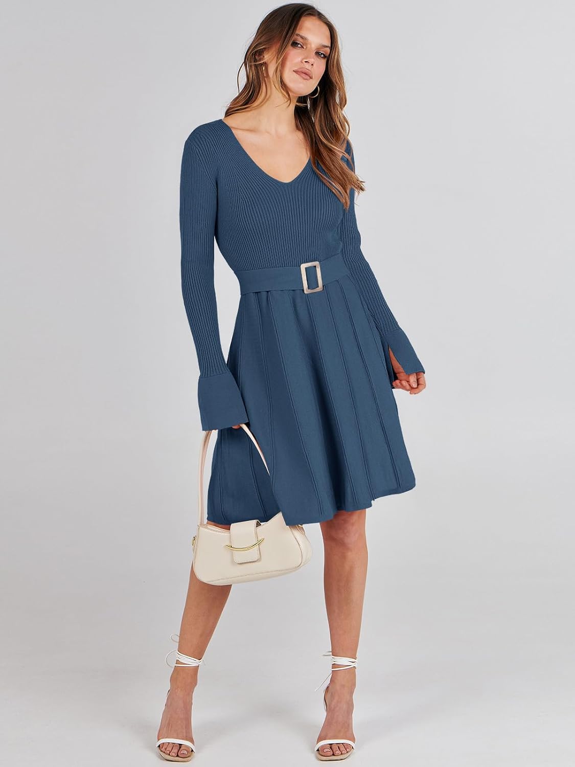 Features – Elevate your fall wardrobe with this chic sweater dress featuring bell long sleeves, a flattering V-neckline, and a trendy tie waist. The ribbed knit fabrication provides a cozy, comfortable feel, while the versatile short length allows for easy layering. The A-line shape with pleated details gives the sweater dress a stylish flair that's perfect for any occasion.