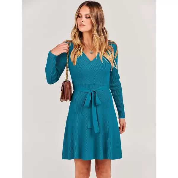 imageANRABESS Womens Sweater Dress V Neck Long Sleeve Tie Waist ALine Swing Ribbed Knit Short Dresses with BeltNavy Blue