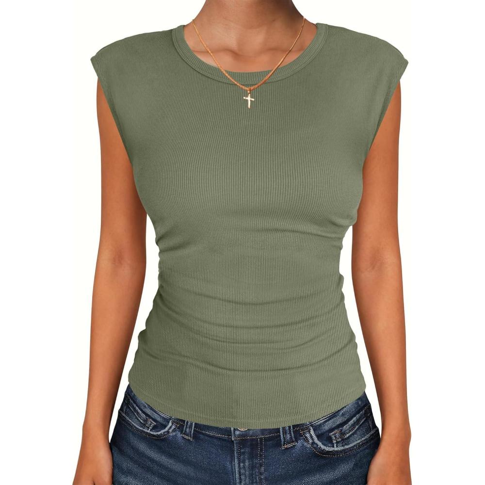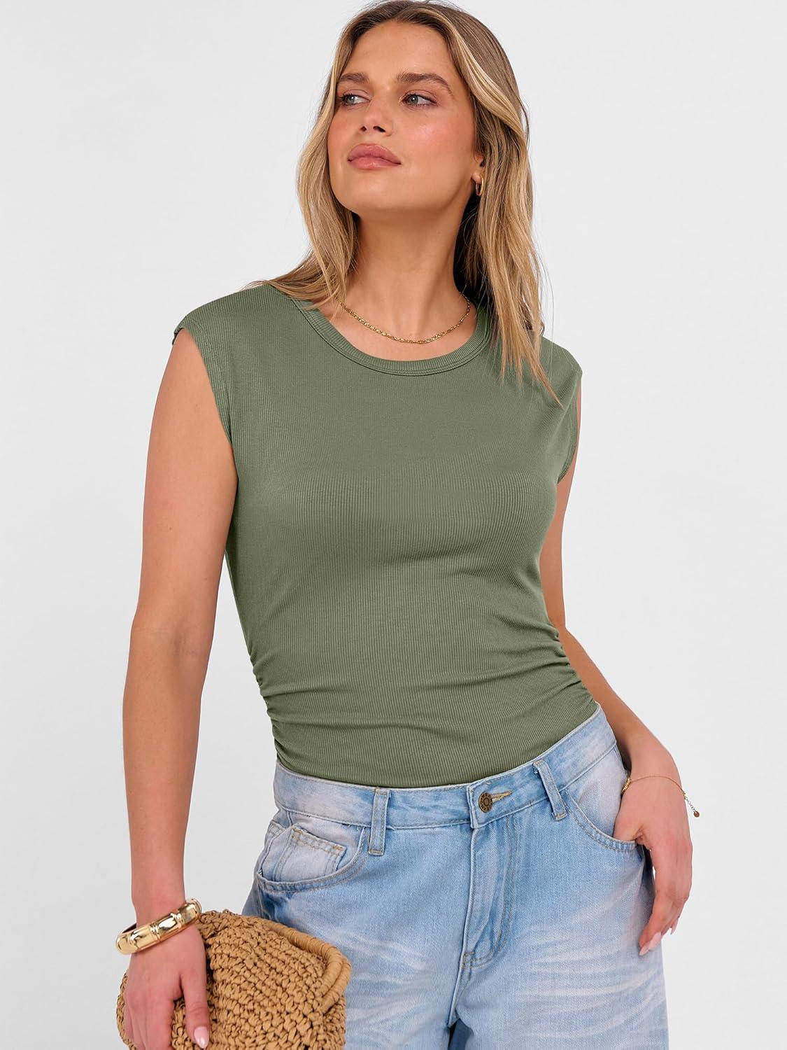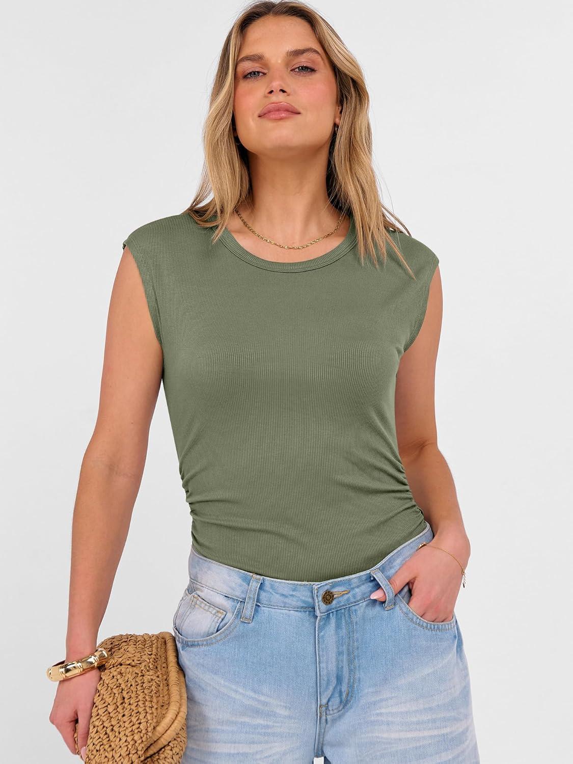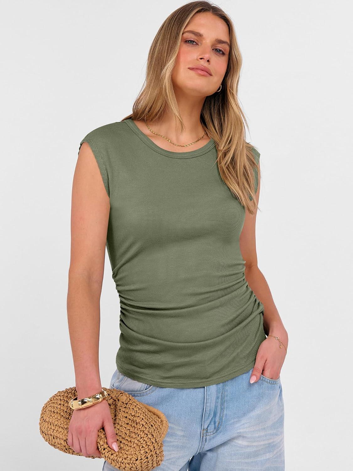 ANRABESS Womens Tops Cap Sleeve Crewneck Shirts Casual Ribbed Knit Slim Fit Ruched Summer Basic Tee Tank 2026 Trendy Clothes(Army Green)