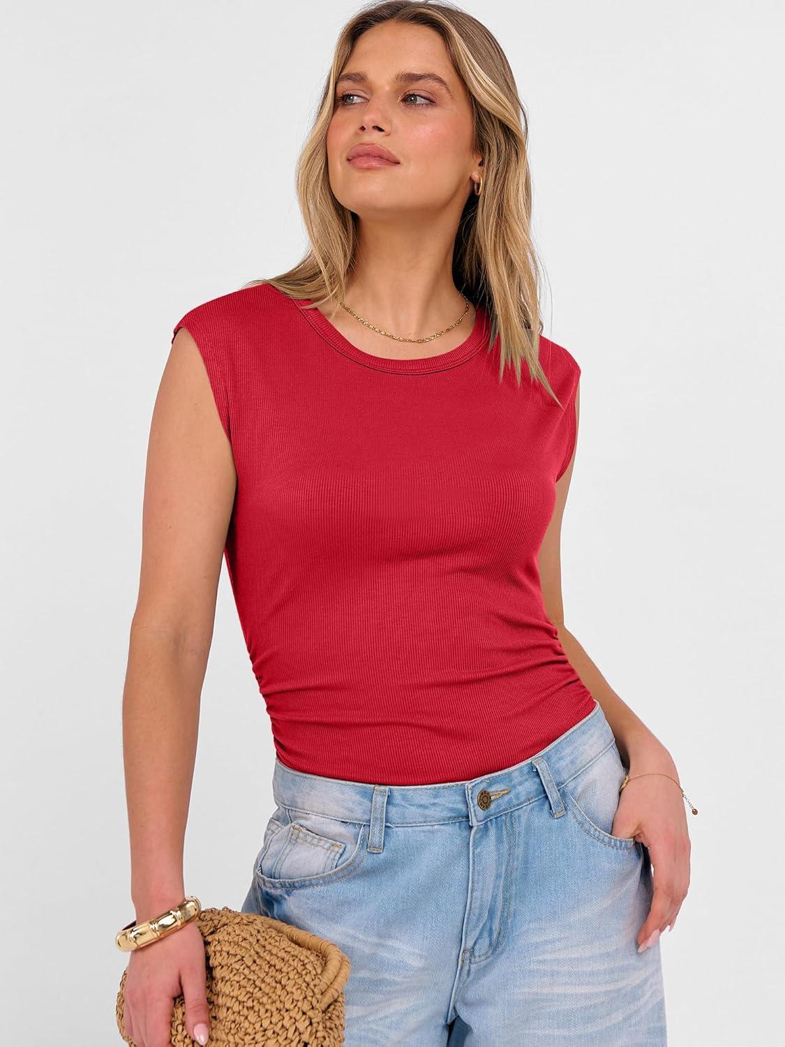 ANRABESS Womens Tops Cap Sleeve Crewneck Shirts Casual Ribbed Knit Slim Fit Ruched Summer Basic Tee Tank 2026 Trendy Clothes(Red)