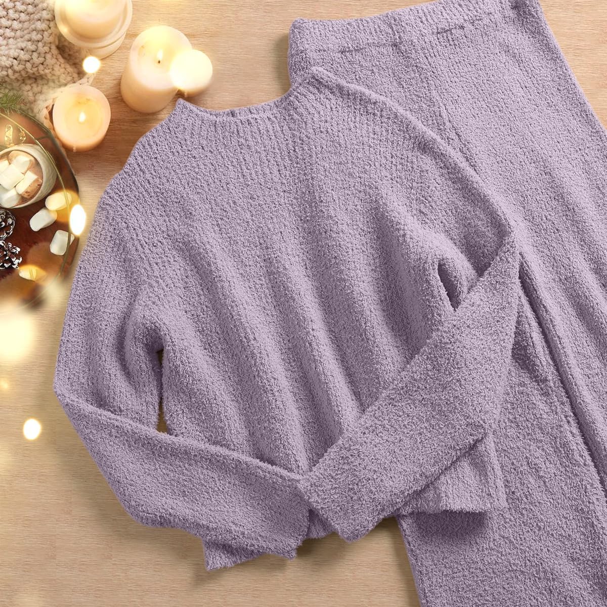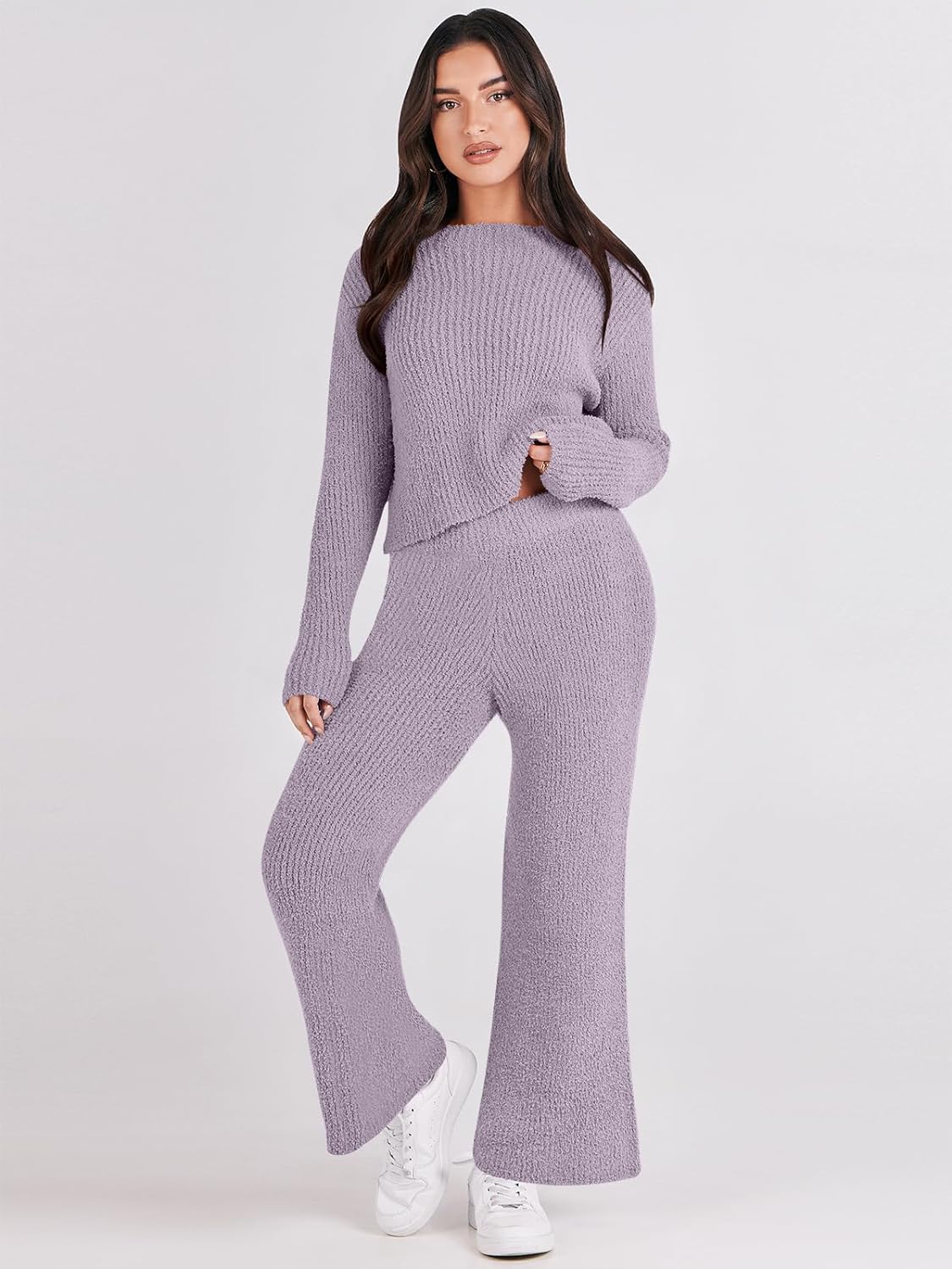 ANRABESS Women's Two Piece Outfits Chunky Knit Fuzzy Sweater Set Long Sleeve Crop Pullover Wide Leg Pant Matching Lounge Set(Purple)