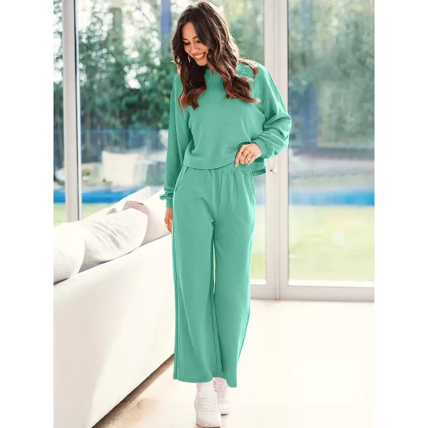 imageANRABESS Womens Two Piece Outfits Long Sleeve Crop Top Wide Leg Pants Knit Sweatsuit Loungewear Sweatsuit SetLake