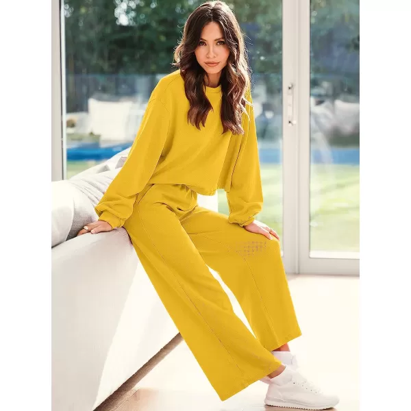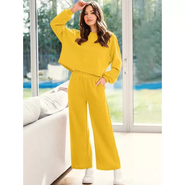 ANRABESS Women’s Two Piece Outfits Long Sleeve Crop Top Wide Leg Pants Knit Sweatsuit Loungewear Sweatsuit Set(Yellow)