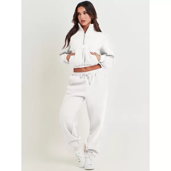 ANRABESS Women's Two Piece Outfits Long Sleeve Half Zip Crop Sweatsuit with Jogger Pants Lounge Sets with Pockets(White)