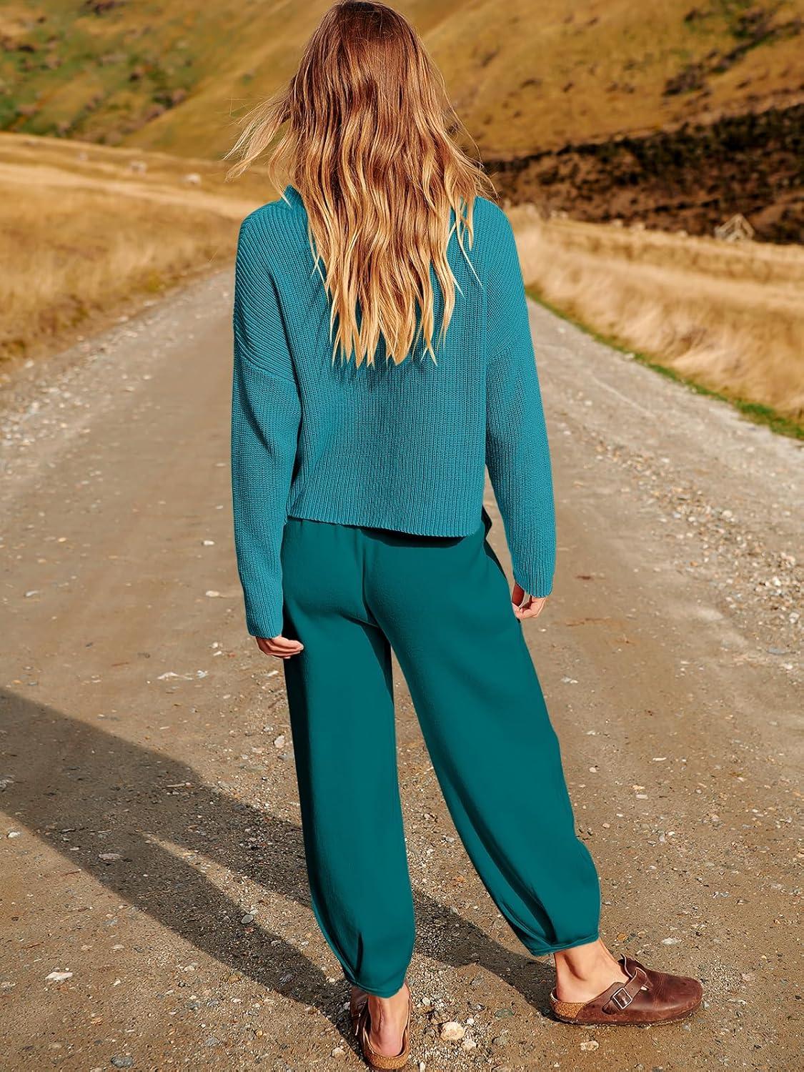 ANRABESS Women's Two Piece Outfits Long Sleeve Knit Top Fall Sweater Set Oversized Pants Tracksuit Lounge Sets(Deep Green)