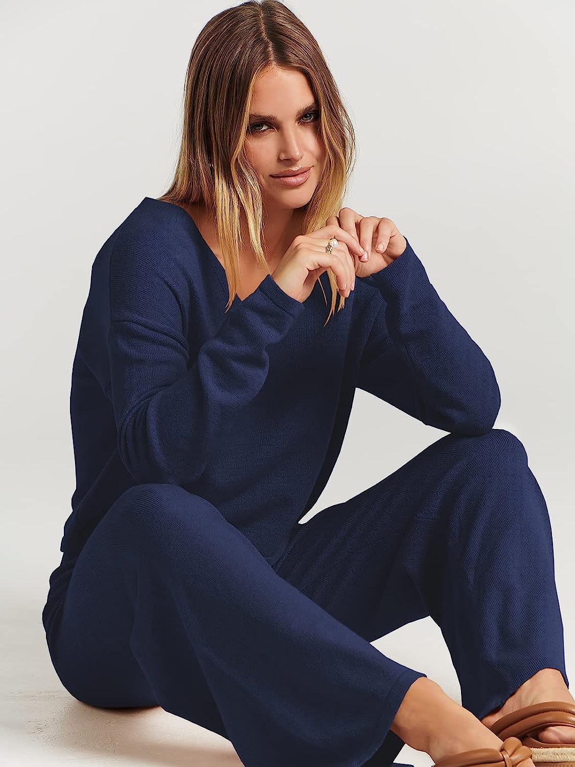 imageANRABESS Womens Two Piece Outfits Long Sleeve V Neck Crop Top with High Waist Wide Leg Pants Sweater Sets Lounge WearBlue