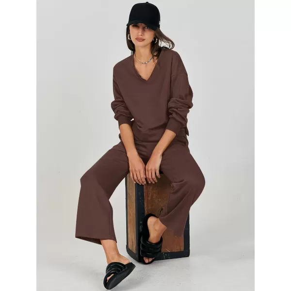 ANRABESS Women’s Two Piece Outfits Matching Sets Long Sleeve Crop Pullover Top and Wide Leg Pants Tracksuit Lounge Set(Brown)