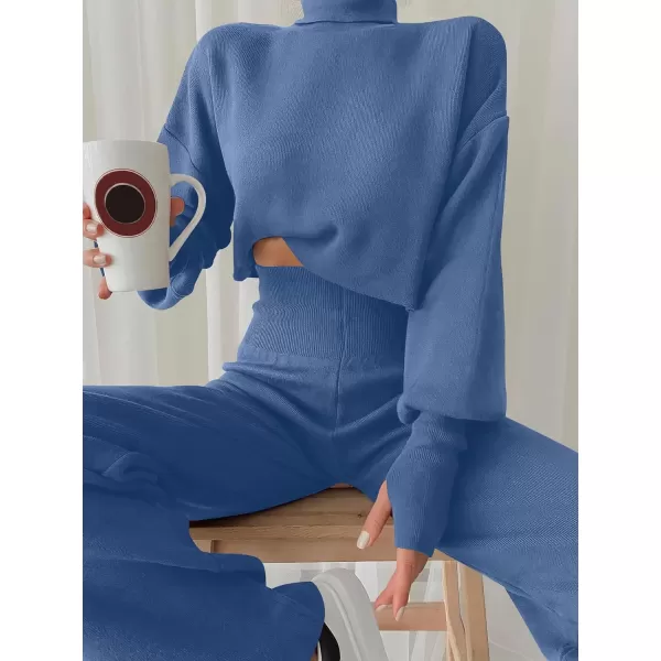 ANRABESS Women's Two Piece Outfits Sweater Sets Long Sleeve Turtleneck Knit Crop Pullover and Wide Leg Pant Lounge Sets(Blue)