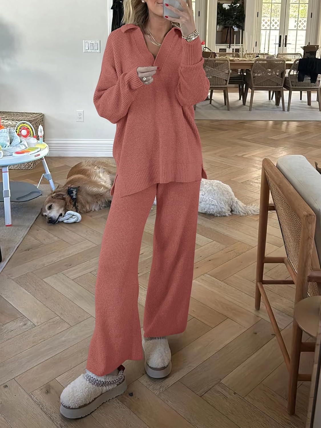 ANRABESS Womens Two Piece Outfits Sweater Sets Waffle Knit Pullover Wide Leg Pants Tracksuit Sweatsuits Matching Lounge Set(Rust)
