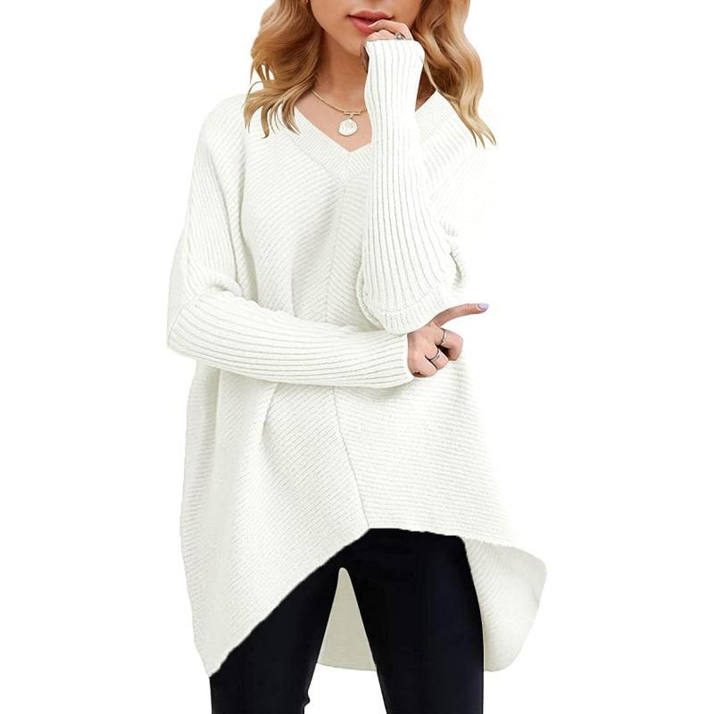 ANRABESS Womens V Neck Oversized Long Batwing Sleeve Asymmetric Hem Casual Pullover Sweater Knit Tops(White)