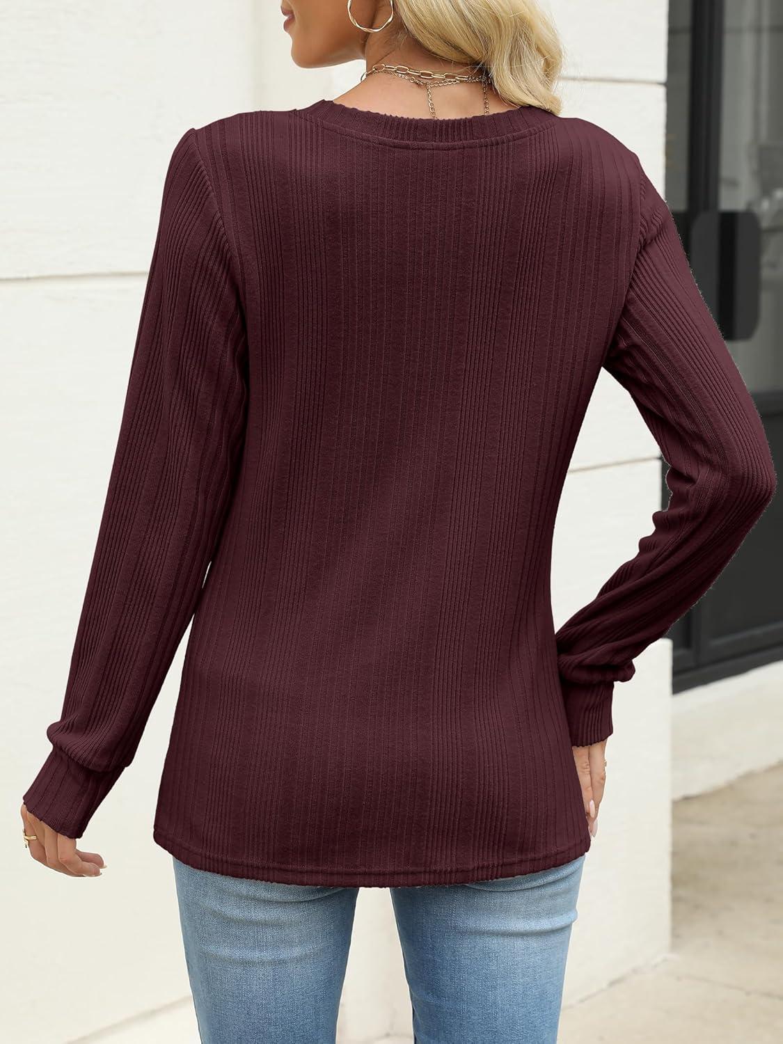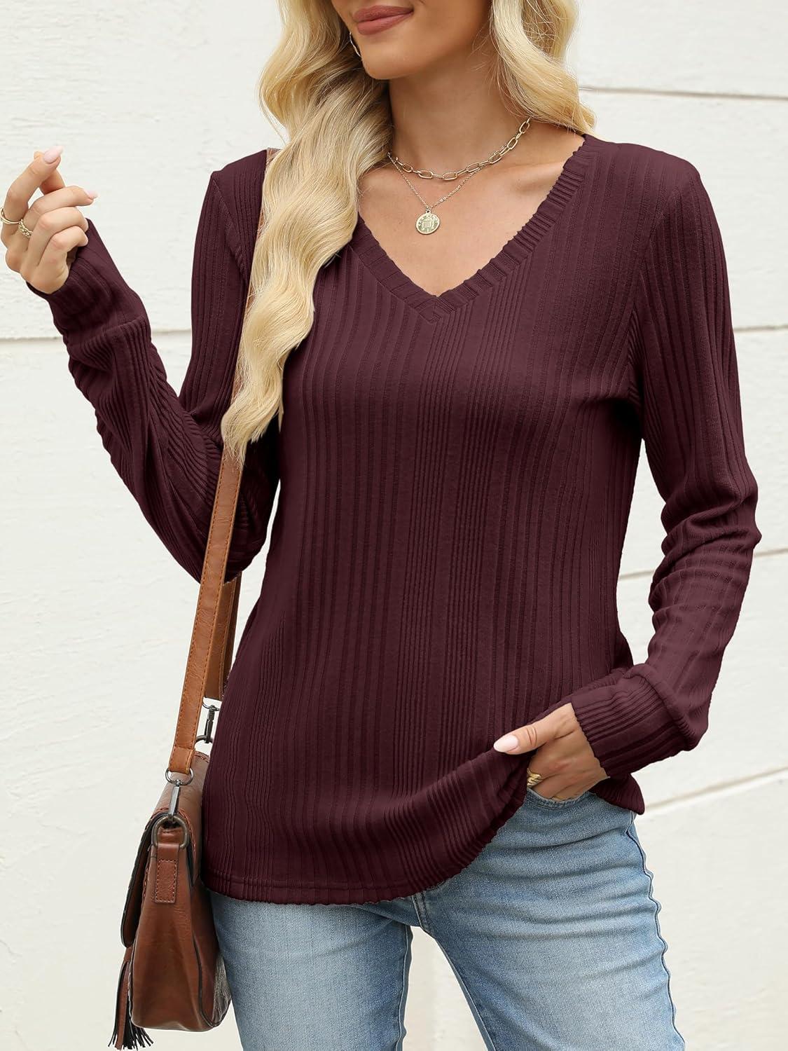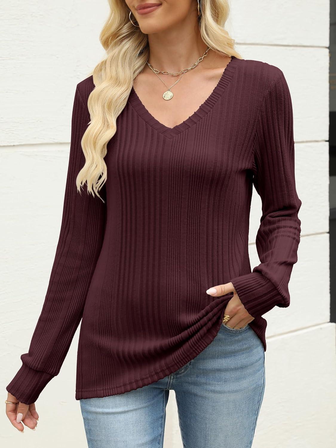ANRABESS Womens V Neck Sweaters 2025 Fall Long Sleeve Shirts Lightweight Ribbed Knit Basic Casual Office Work Tunic Tops(Deep Red)