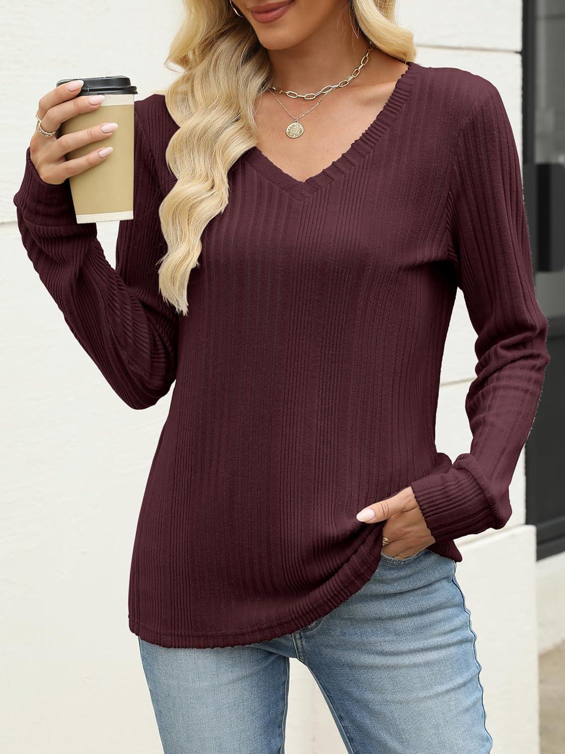 imageANRABESS Womens V Neck Sweaters 2025 Fall Long Sleeve Shirts Lightweight Ribbed Knit Basic Casual Office Work Tunic TopsDeep Red