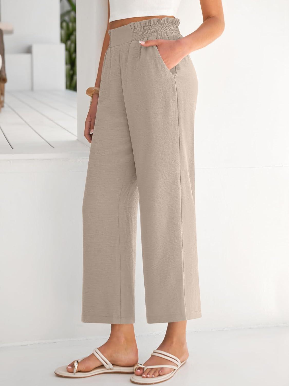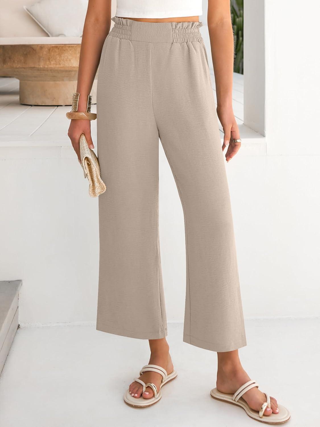imageANRABESS Womens Wide Leg Palazzo Pants Summer Beach High Waisted Cropped Flowy Pants 2026 Dressy Casual Trousers with PocketsParchment